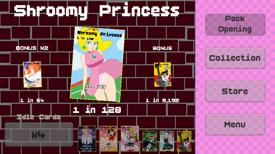 Gotcha Gals! is a collectible card game focusing on everybody's favorite thing; RNG! Collect cards that sequentially become rarer and racier, starting at 1 in 2 odds and finishing somewhere around 1 in 16,000,000 odds. Don't worry though, the rarer the cards in your collection, the better your odds! Start your collection today and see what rare cards you can collect!